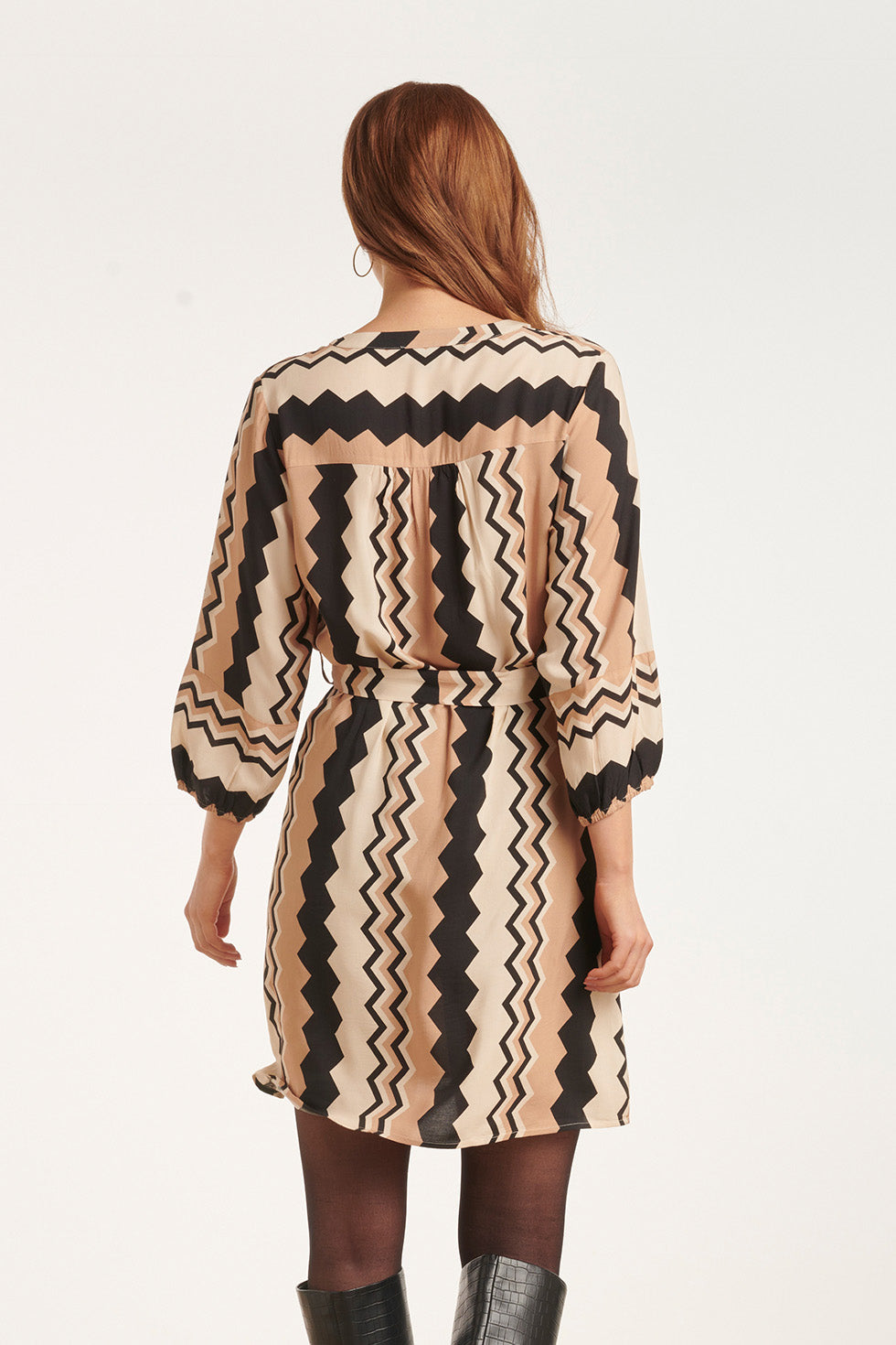 Laat je stijl stralen met de Smashed Lemon zigzag jurk. Deze korte jurk heeft een flatterende V-halslijn met een elegante nekkraag. De losse pasvorm zorgt voor ultiem comfort, terwijl de meegeleverde stoffen riem je taille prachtig accentueert indien gewenst. Met driekwart mouwen en elastische manchetten biedt deze jurk een perfecte mix van gemak en stijl. Gemaakt van 100% rayon, valt de jurk soepel langs het lichaam en heeft een opvallende zwart en zand zigzagprint die in verschillende richtingen is gecombineerd voor een speelse, grafische look.