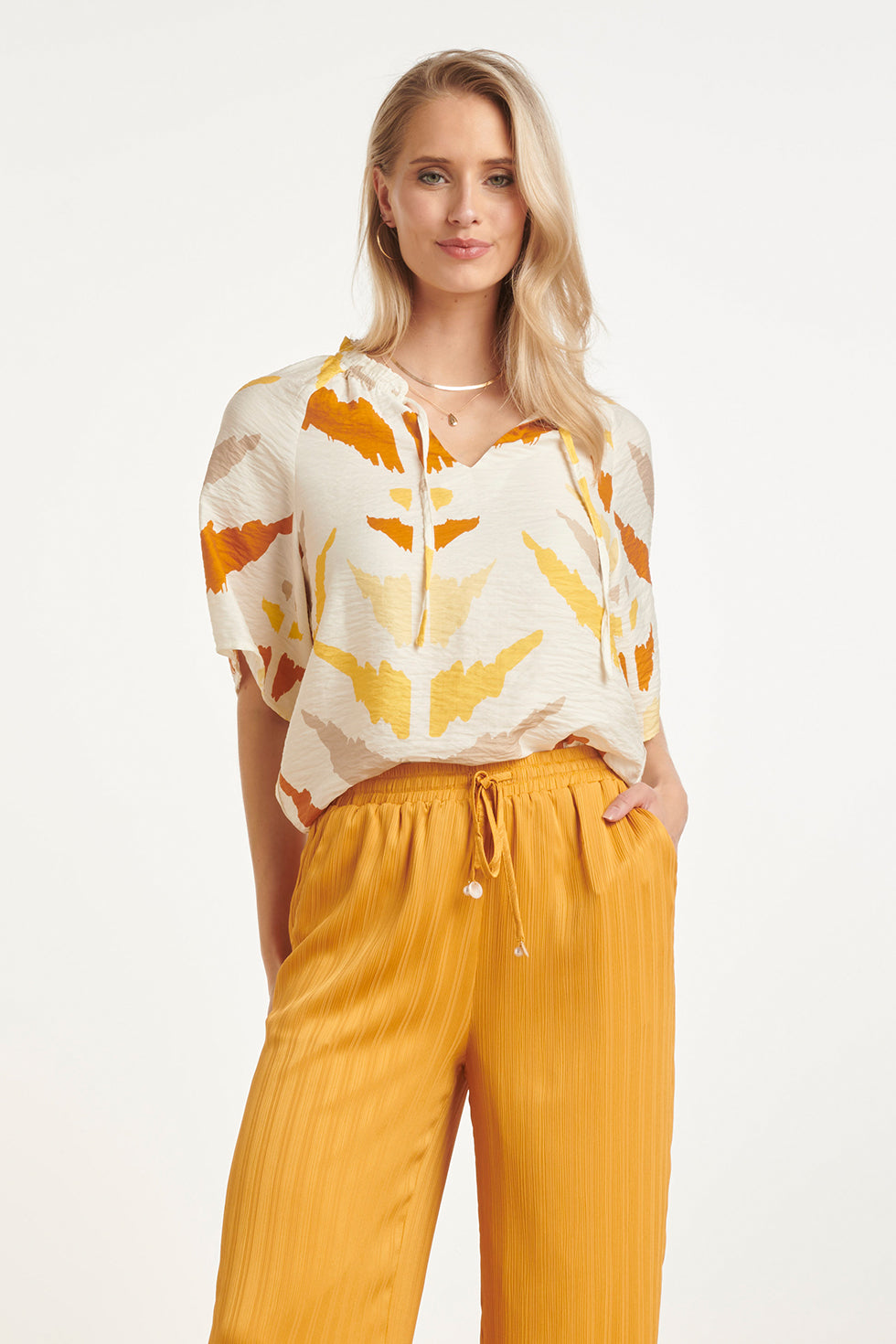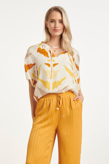 Geef je outfit een energieke boost met deze opvallende top van Smashed Lemon. De aztec print in levendig oranje en geel straalt pure zonneschijn uit. Met de wijde korte mouwen en de verfijnde halslijn met ruches is deze blouse zowel comfortabel als modieus. Belangrijkste kenmerken: Levendige kleuren met een unieke aztec print in oranje en geel. Comfortabele wijde mouwen voor een moderne en luchtige look. Verfijnde halslijn voorzien van koordjes en ruches.