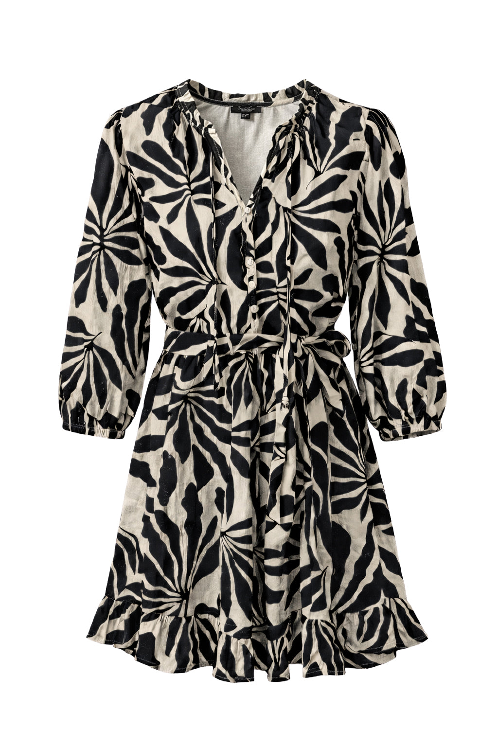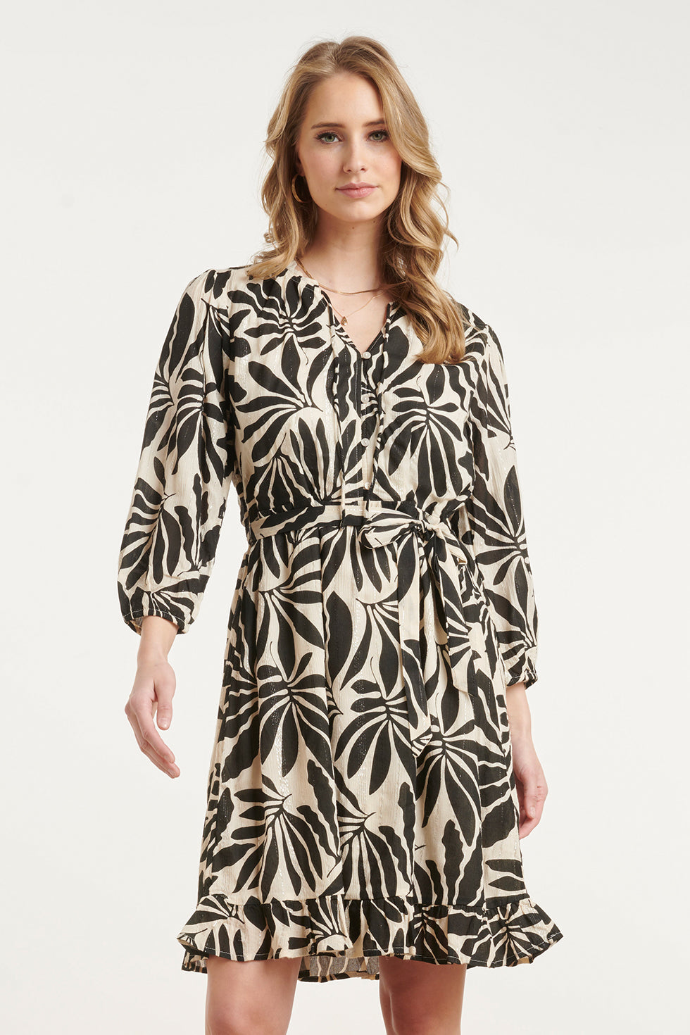 Zwart-Beige Bladerenprint Jurk Met Ceintuur | Black White
