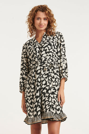 Deze Smashed Lemon zwart-witte jurk heeft een opvallende abstracte print en een vrouwelijke pasvorm. De jurk is voorzien van lange mouwen met elastische manchetten en een knoopsluiting aan de voorzijde. De taille wordt geaccentueerd door een bijpassende strikceintuur. De onderzijde is afgewerkt met een speelse ruffle rand met subtiele contrastdetails. De jurk valt boven de knie. Een moderne en trendy keuze voor iedere gelegenheid. Belangerijke kenmerken: Zwart-witte abstracte print Lange mouwen en knoopsluiting Ceintuur en ruffle zoom