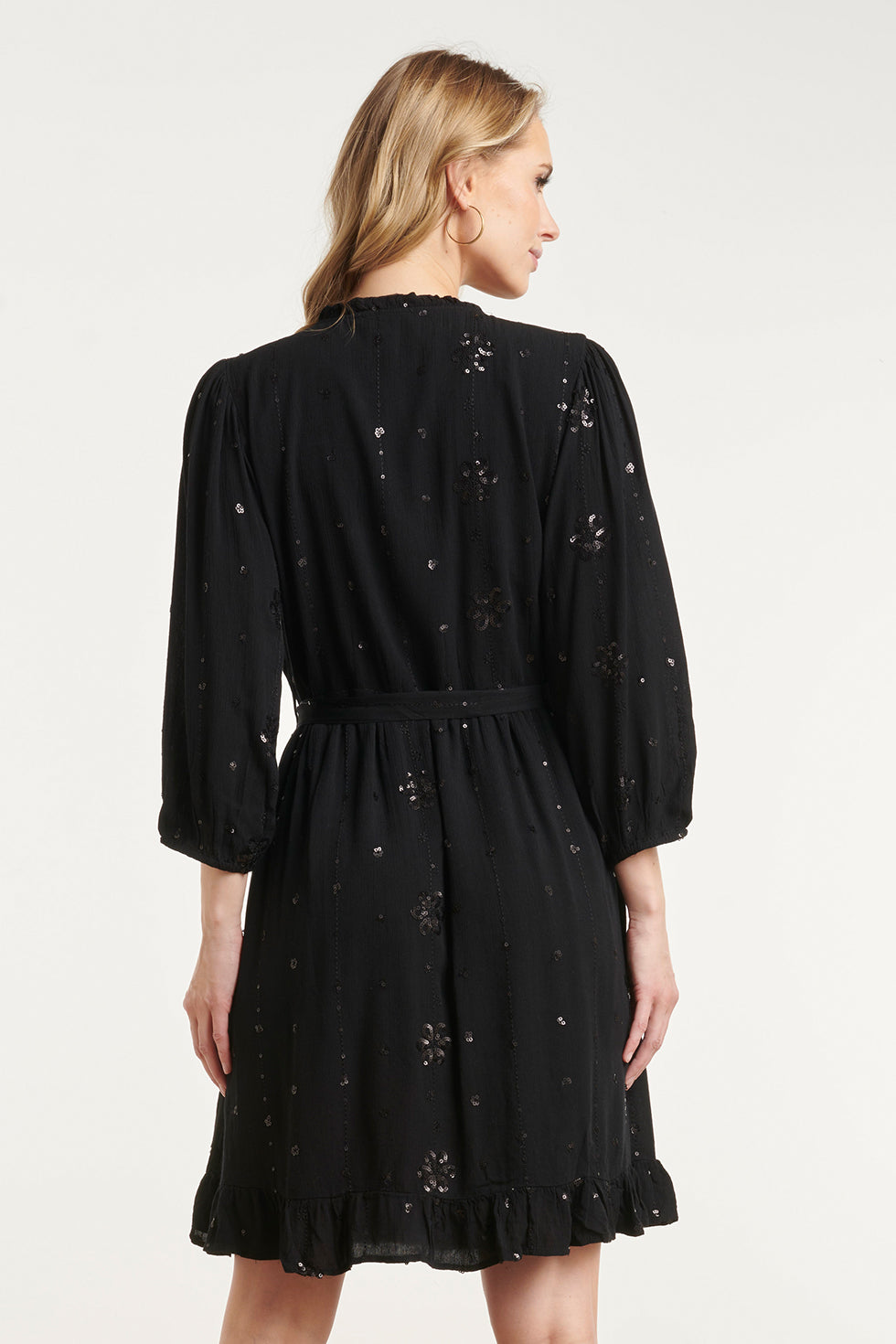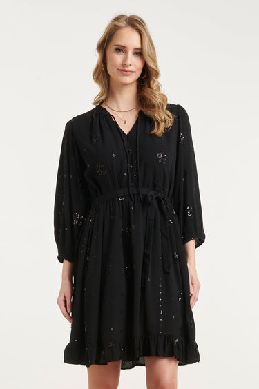 Deze elegante Smashed Lemon zwarte midi jurk is verrijkt met subtiel goudkleurig borduursel. De jurk heeft lange ballonmouwen met elastische manchetten en een V-hals met knoopdetails. De bijpassende tailleband zorgt voor een getailleerde pasvorm. De midi lengte en ruffle onderaan geven de jurk een vrouwelijke en verfijnde uitstraling. Perfect voor een feestelijke of geklede gelegenheid. Belangerijke kenmerken: Zwart met goudkleurig borduursel Midi lengte met ruffle zoom Lange ballonmouwen en tailleband