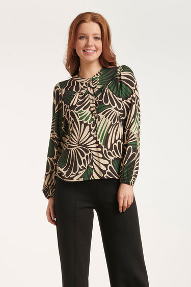 Breng een frisse en dynamische uitstraling in je modecollectie met de Smashed Lemon Groene en Zwarte Grafische Print Top. Deze stijlvolle top combineert moderne grafische vormen in groentinten, zwart en zandkleur voor een opvallend en trendy design. Perfect voor zowel casual als chique gelegenheden, biedt deze top een verfijnde en eigentijdse look. De top is ontworpen met een ronde halslijn met knopen die tot aan de borst reiken, waardoor een elegante en verfijnde uitstraling ontstaat. Het V-vormige paneel op de borst voegt extra dimensie en detail toe. De losse pasvorm en lange pofmouwen met elastiek en frill aan de manchetten zorgen voor een comfortabele en flatterende pasvorm. Gemaakt van 100% viscose, biedt de top een zachte en ademende draagervaring. Voeg een vleugje flair toe aan je outfit met de Smashed Lemon Groene en Zwarte Grafische Print Top. Deze top is een veelzijdige keuze die je kunt combineren met je favoriete jeans voor een casual look of met een elegante rok voor een verfijnde uitstraling. Perfect voor elke gelegenheid, deze top maakt je stijl compleet en biedt tegelijkertijd optimaal comfort.