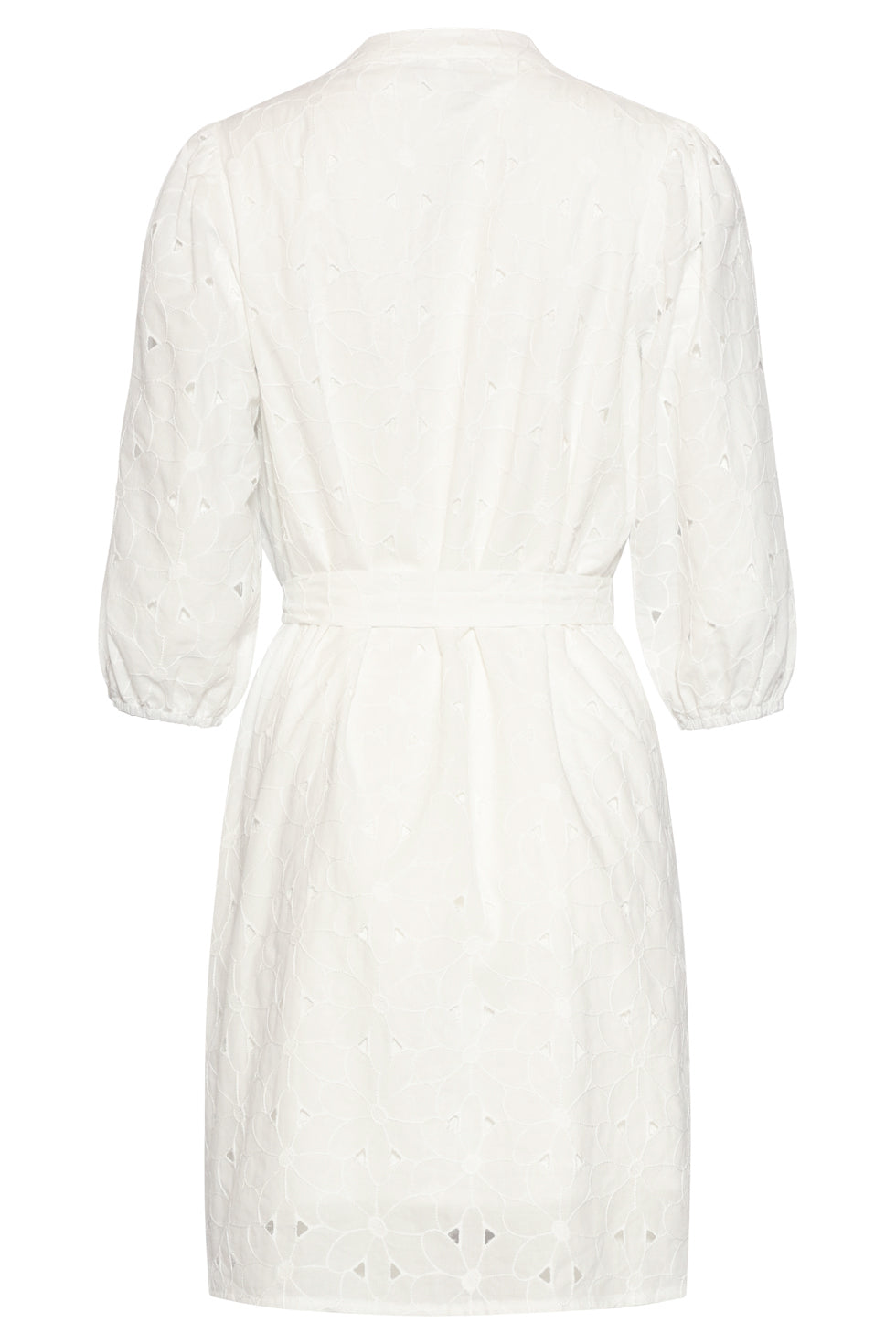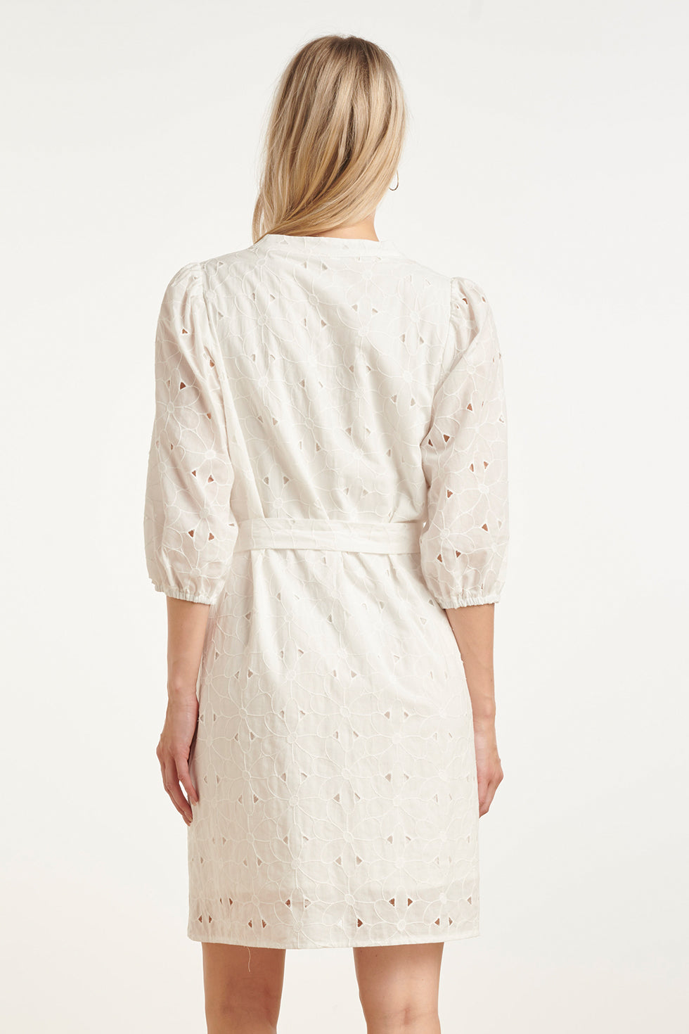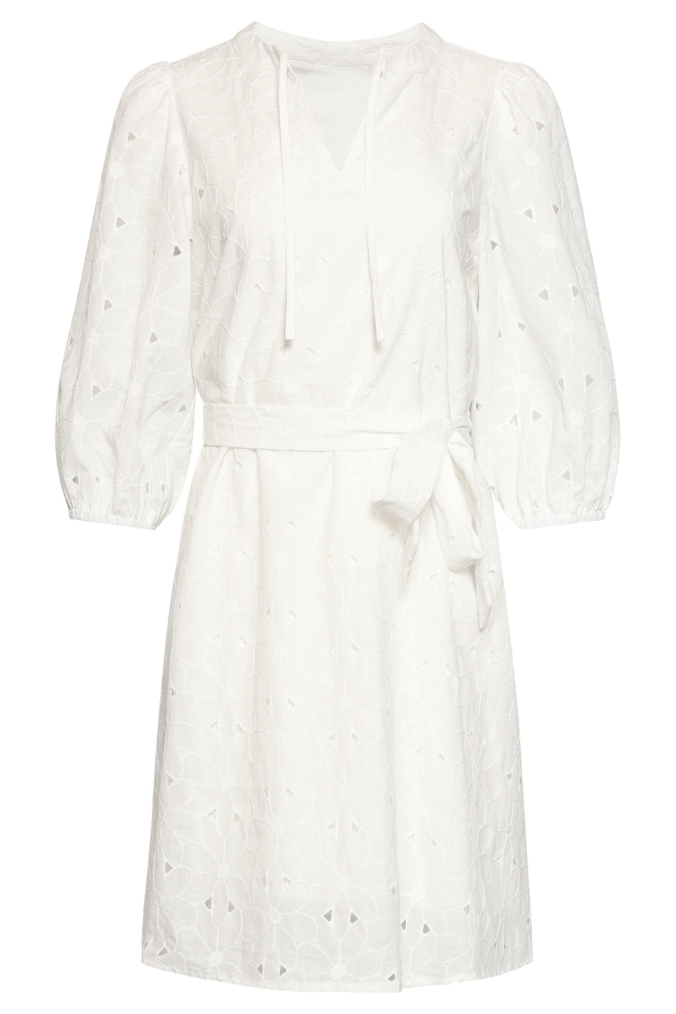Witte Broderie Jurk Met V-Hals En Strikceintuur | White