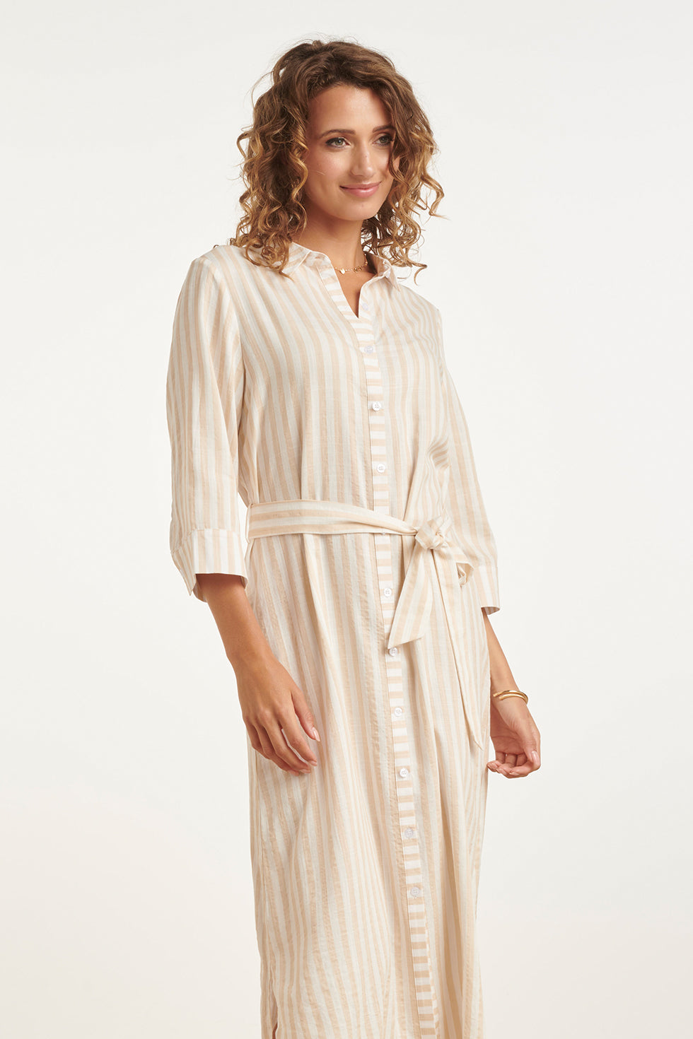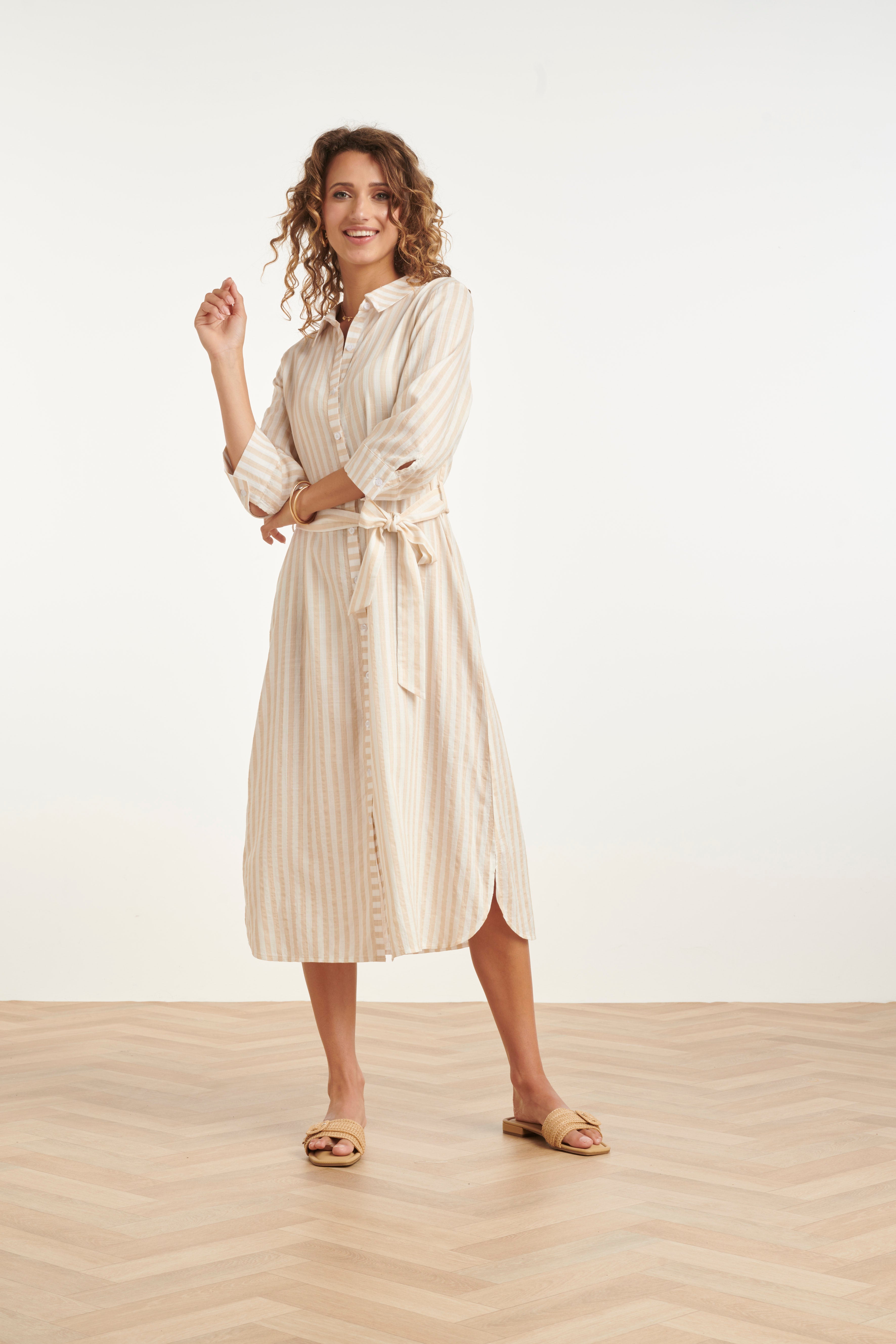 Gestreepte Maxi-Jurk Met Tailleceintuur | Dark Sand - Off White