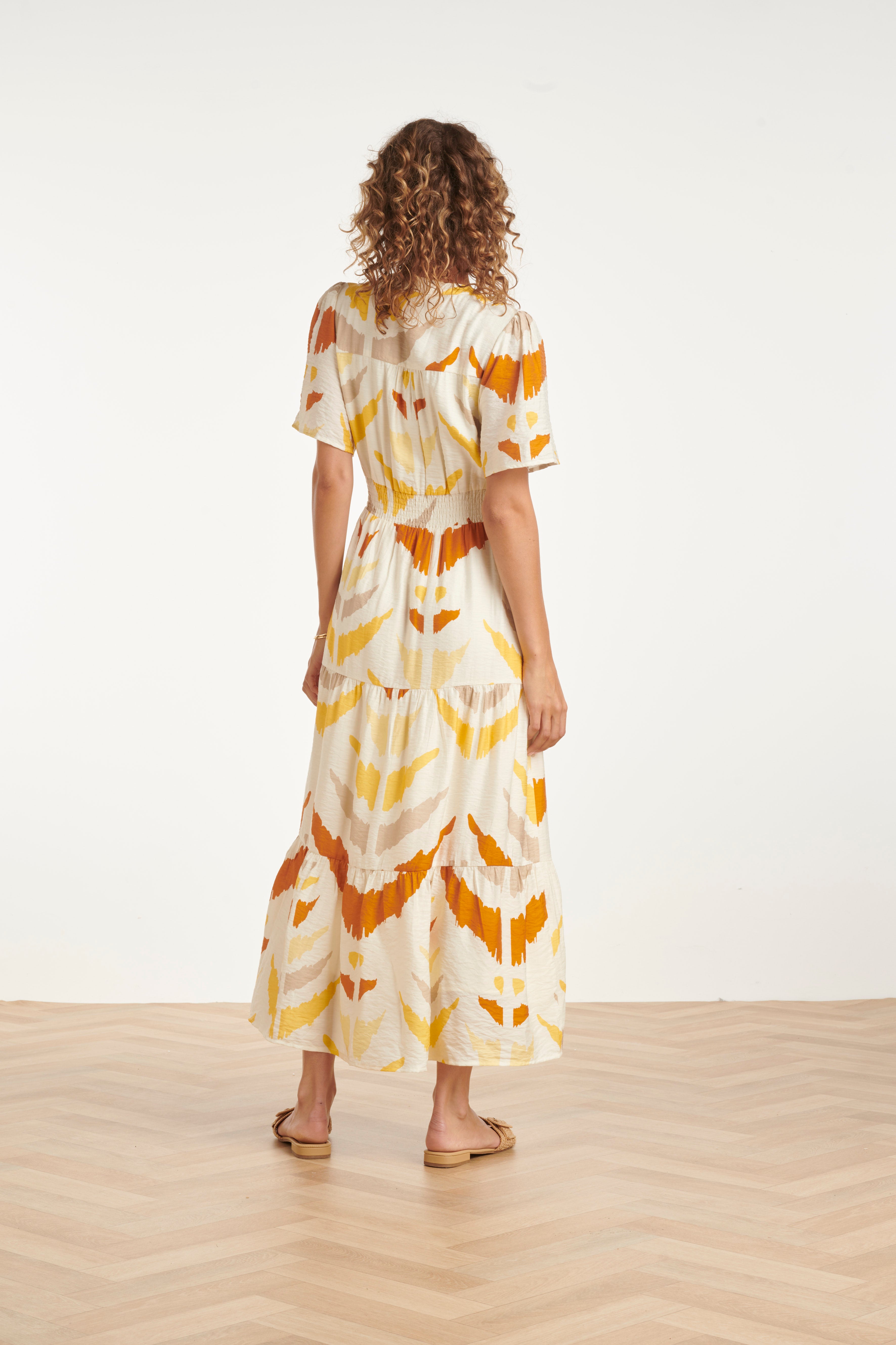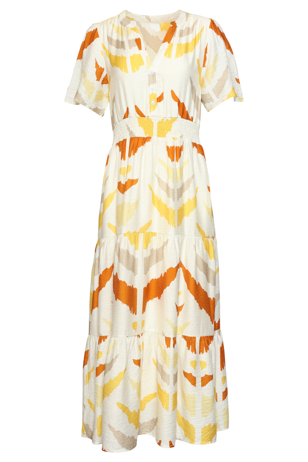 Vestido Midi Decote em V com Estampa Asteca Laranja | Branco - Amarelo