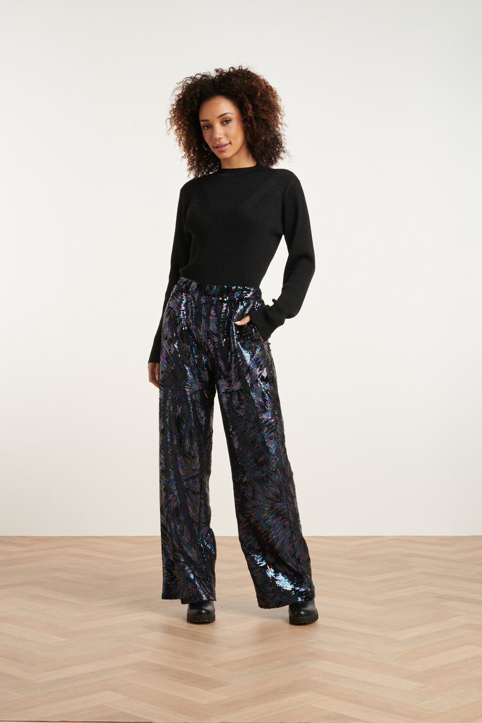Adicione um toque de glamour ao seu guarda-roupa com a Smashed Lemon preta de gola alta canelada. Este elegante top de malha é feito de uma mistura de viscose de luxo com lurex, proporcionando um brilho sutil que é perfeito tanto para ocasiões diárias quanto festivas. A estrutura canelada em forma de V e a gola funil dão ao suéter uma aparência moderna e refinada.